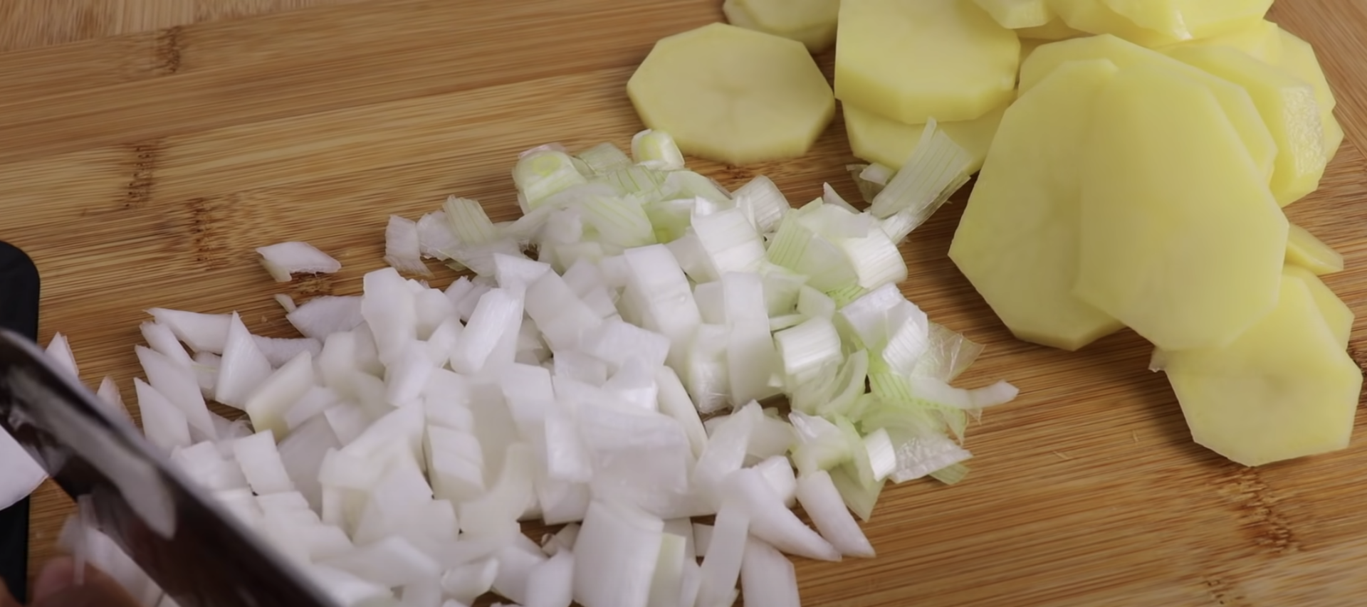 Pokrój cebulę i pieczarki w średnią kostkę, ziemniaki natomiast w plasterki (około 1 cm).