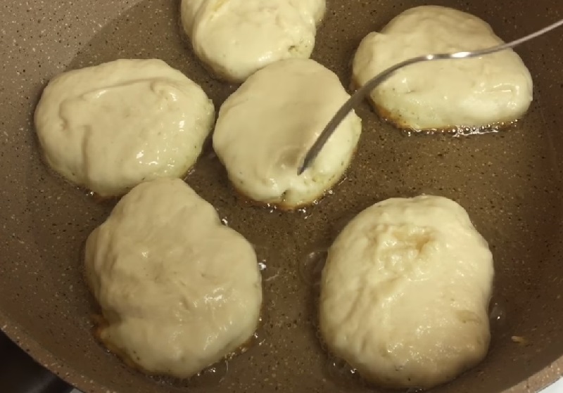 Przy użyciu łyżki nałożyć ciasto na patelnie, 1 łyżka to 1 placek. Smażyć z obu stron do uzyskania złocistego koloru.