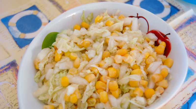 Kapustę cienko siekamy. Jabłka kroimy w cienkie plasterki. Dodajemy kukurydzę. Całość skrapiamy octem jabłkowym i olejem słonecznikowym oraz doprawiamy solą.