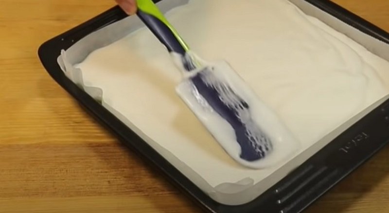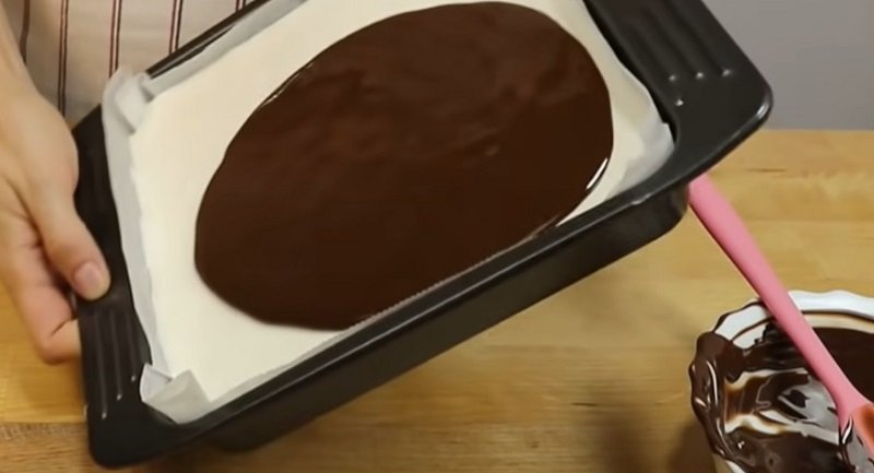 Wlej mieszankę do naczynia do pieczenia wyłożonego pergaminem (rozmiar 20 x 20 cm) i przykryj folią spożywczą. Włóż do lodówki lub zamrażarki i poczekaj, aż składniki się zestalą.