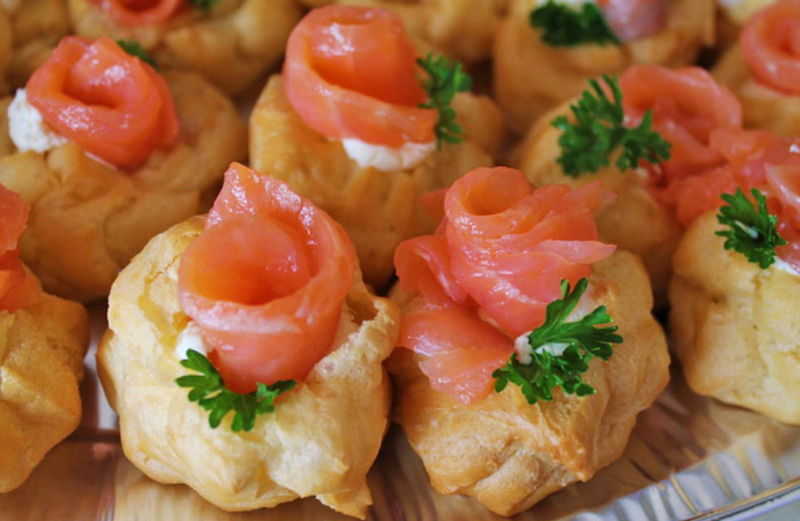 Wymieszaj 200 g twarogu ze szczyptą ziół prowansalskich, dodaj trochę czarnego pieprzu i soli. Łososia (80 g) pokrój w cienkie plasterki. Profiterole wypełnij masą serową, umieść plasterek ryby na środku każdego. Udekoruj kompozycję sałatą lub ziołami.