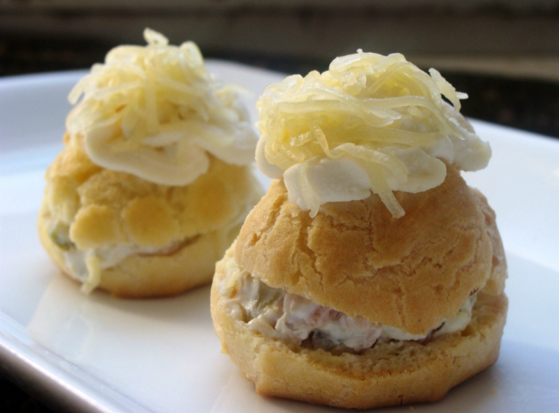 Pokrój 8 paluszków krabowych i 1 ogórka w małą kostkę, dodaj 1 jajko ugotowane na twardo, starte na tarce o małych oczkach i 50 g roztartego widelcem twarogu. Dodaj 3 łyżki majonezu, pieprz do smaku, skrop sokiem z cytryny, wymieszaj. Napełnij profiteroles nadzieniem.