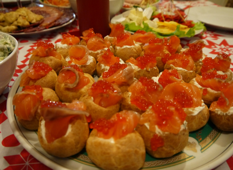 Wymieszaj 200 g twarogu z 1 gotowanym jajkiem, startym na tarce z małymi otworami. Posól, popieprz do smaku. Napełnij profiteroles przygotowaną mieszanką. Udekoruj przystawkę plasterkami wędzonego łososia i czerwonym kawiorem.