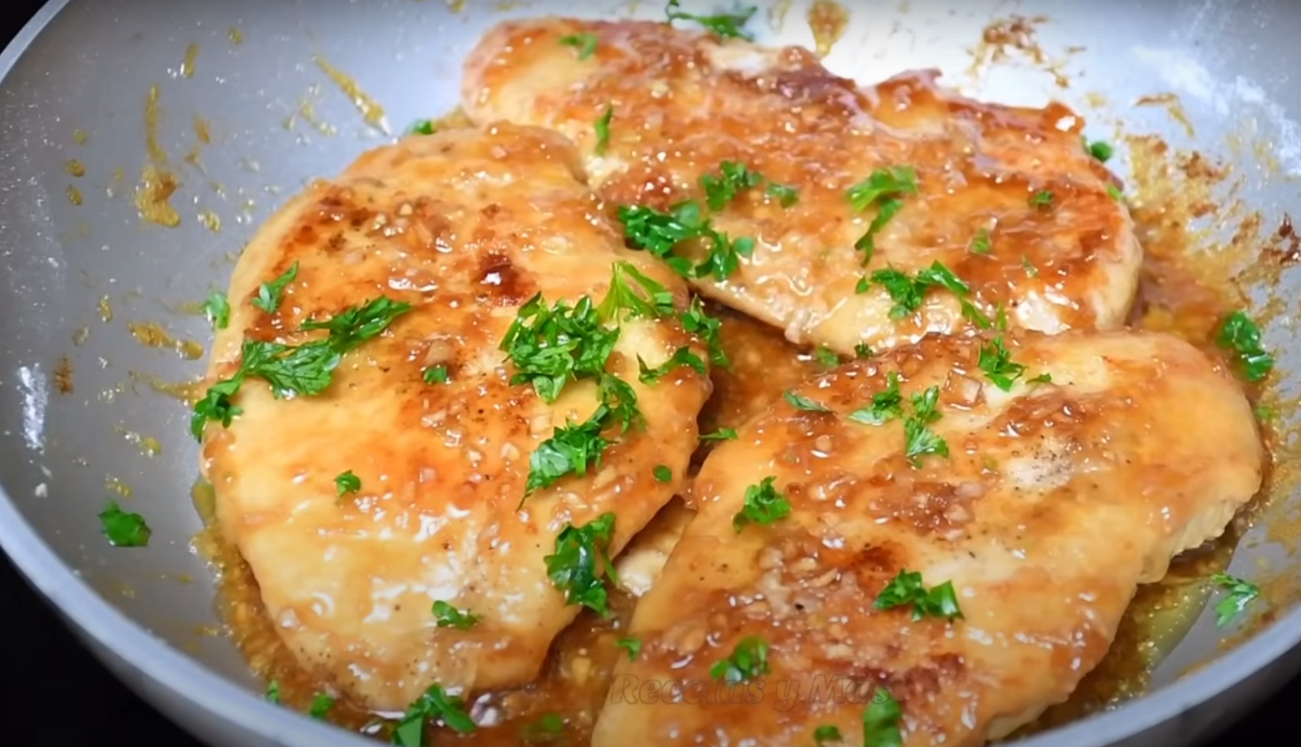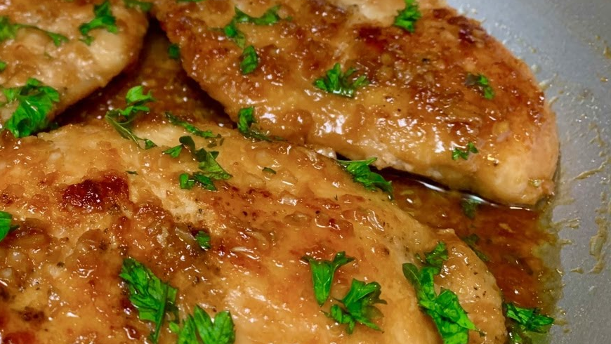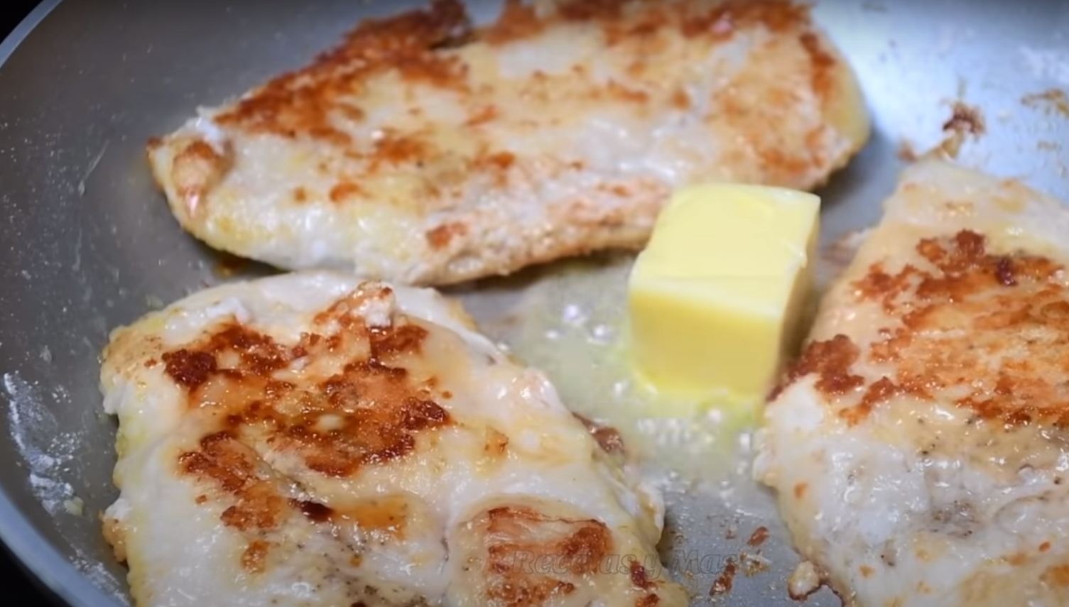 Najpierw przekrój pierś z kurczaka na pół, aby uzyskać cienkie plasterki. Posyp solą i pieprzem z jednej i drugiej strony. Następnie obtocz plastry mięsa w mącę. Na patelnię dodaj oliwę, rozgrzej i piecz mięso z obu stron na złoty kolor. Gdy kurczak jest upieczony, dodaj do niego masło i pozwól mu się stopić.