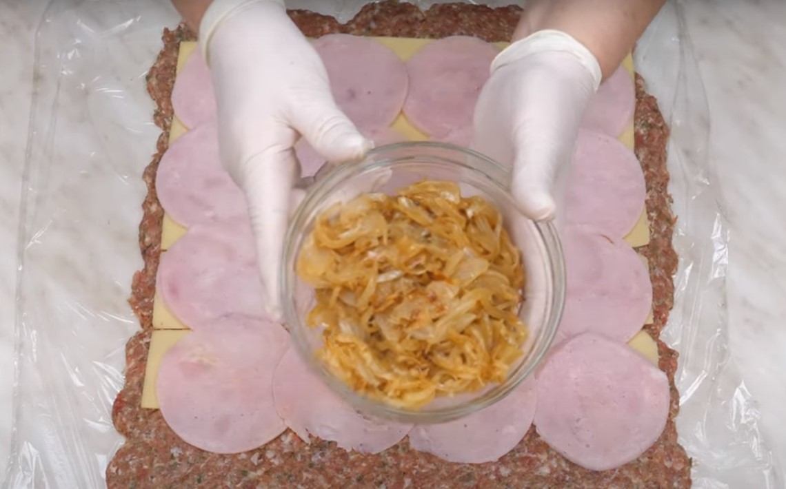 Wszystko dobrze wymieszaj, przykryj folią spożywczą i przechowuj w lodówce przez 1 godzinę. Następnie na blacie rozłóż długi i dość szeroki kawałek folii spożywczej, a na nim rozprowadź mieszankę mielonego mięsa na warstwą o grubości ok. 1 cm i w kształcie prostokąta o wymiarach ok. 30 x 40 cm. Przykryj mięso plastrami sera, szynką i smażoną cebulą.