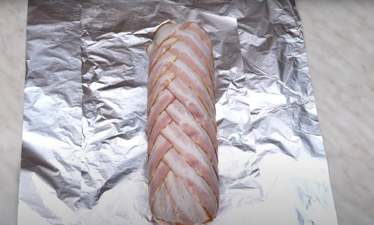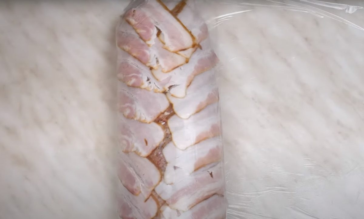 Boczek ułóż na kolejnym kawałku folii spożywczej w formie jak na zdjęciu poniżej. Zawiń roladę w boczek, a następnie w folię spożywczą.