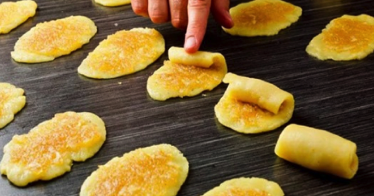 Kawałek ciasta o wadze około 30 gram zwinąć w kulkę. Rozwałkować je, a potem wyłożyć na niego nadzienie i po wypoziomowaniu skręcić w rulon.