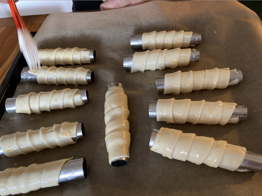 Ciasto rozwałkuj na grubość 2 mm i pokrój na paski tej samej szerokości. Rurki smarujemy, a następnie nawijamy na nie ciasto. Wszystkie rurki możesz następnie posmarować roztrzepanym jajkiem. Piecz 12-15 min, aż do zarumienienia. Pozostaw do wystygnięcia. Następnie wyciągnij rurki, uważając przy tym na kruche ciasto.