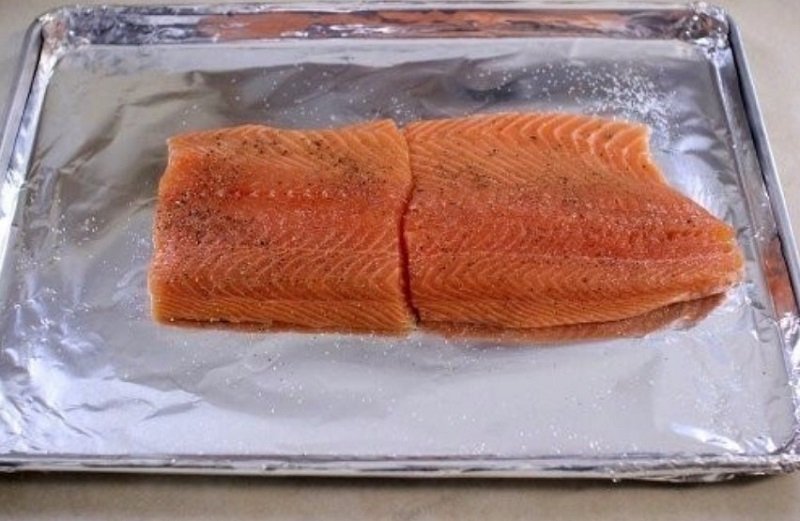 Wyciąć ości z ryby np. za pomocą pincety. Blachę do pieczenia wyłożyć folią i przenieść na nią rybę, którą należy posolić i popieprzyć.