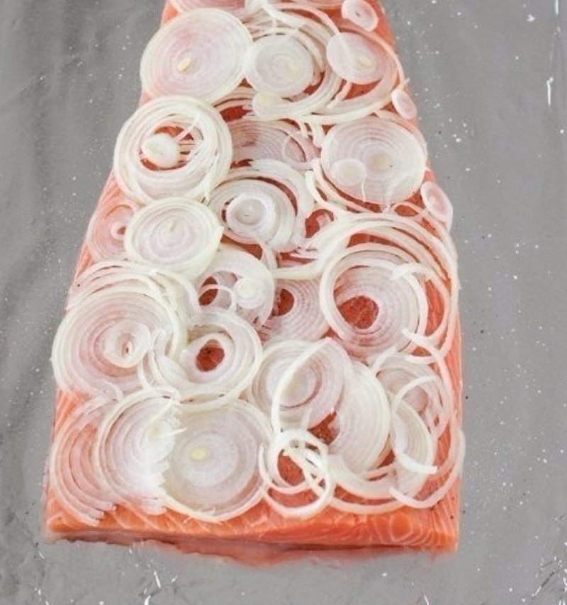 Cebulę obrać i pokroić w cienkie plastry, a następnie rozłożyć ją na przyprawionym łososiu. Majonez dokładnie wymieszać za pomocą łyżki z sokiem z cytryny, musztardą oraz posiekanym czosnkiem aż do widocznego połączenia się składników.