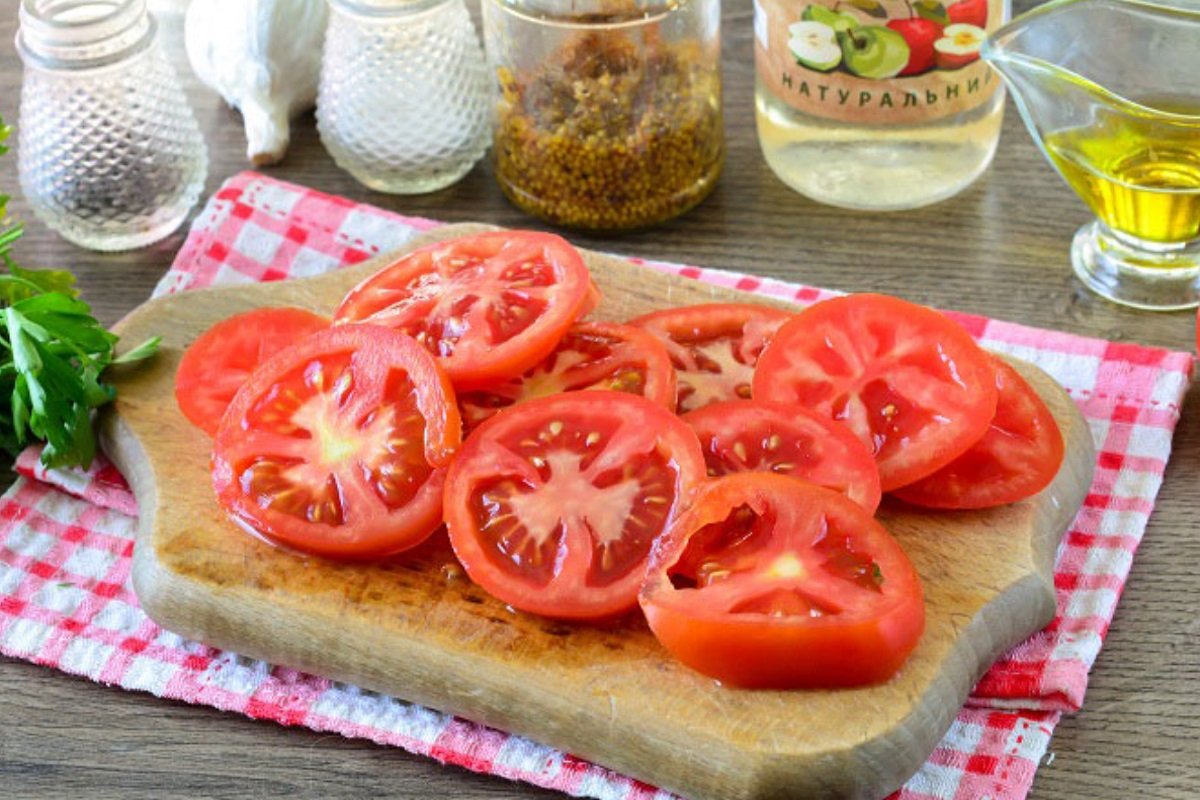 Dodaj zioła prowansalskie, drobno posiekaną pietruszkę, musztardę Dijon, ocet, sól i pieprz. Pokrój pomidory na plasterki. Lepiej jest wybrać pomidory o średniej lub małej wielkości, aby plastry były w przybliżeniu takie same i nie rozpadały się.