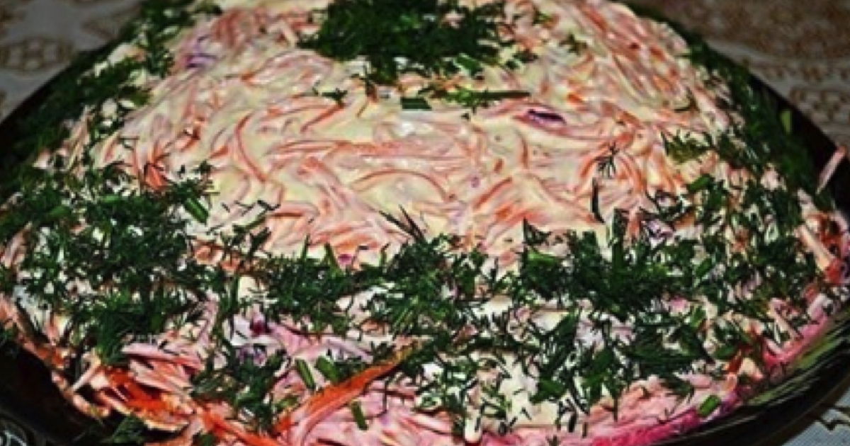 Ugotuj wołowinę i pokrój ją w cienkie paski. Ułóż pierwszą warstwę w naczyniu. Obierz jabłko i zetrzyj je. Położyć na mięso i posmaruj odrobiną majonezu. Ugotuj ziemniaki i zetrzyj. Ułóż z nich trzecią warstwę i posmaruj majonezem. Czwarta warstwa to starte ugotowane buraki.