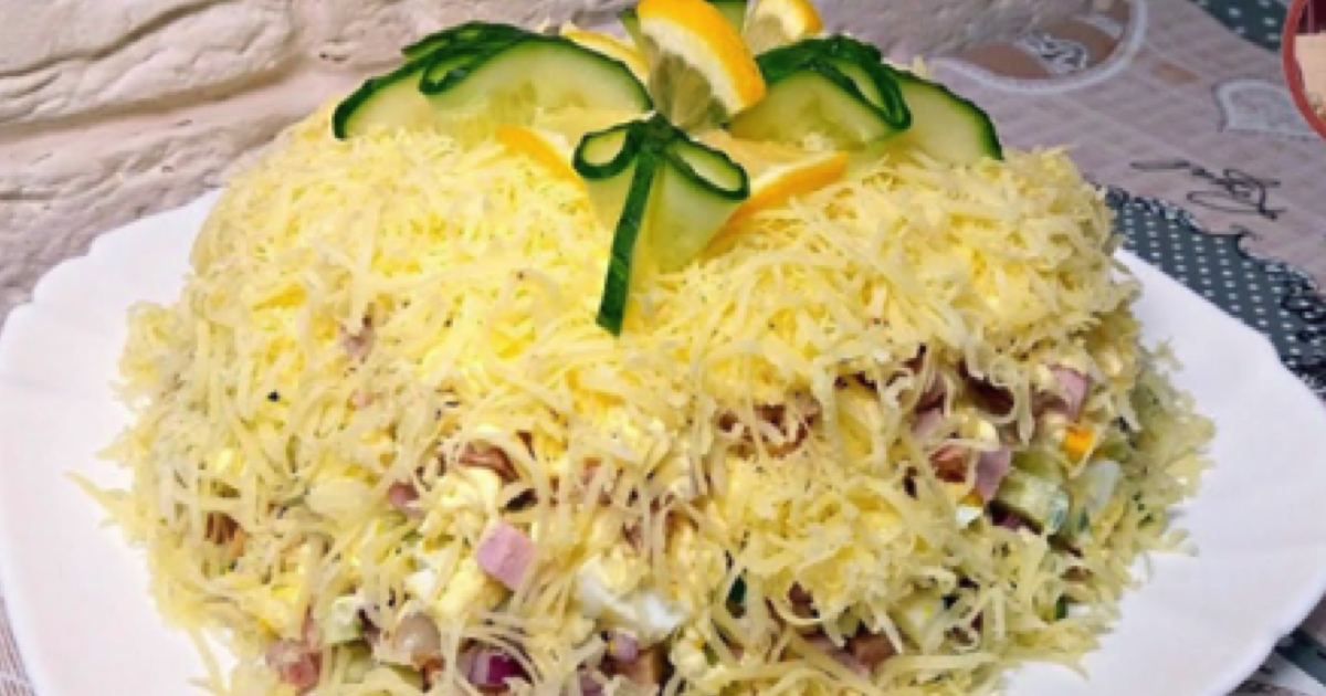 Pokrój w kostkę szynkę, jajka ugotowane na twardo, świeżego ogórka i marynowane grzyby. Drobno posiekaj cebulę. Rozłóż połowę mięsa na talerzu do serwowania, posmaruj je delikatnie majonezem. Następnie rozłóż grzyby, posyp cebulą. Kolejna warstwa to ogórki. Posmaruj je majonezem.