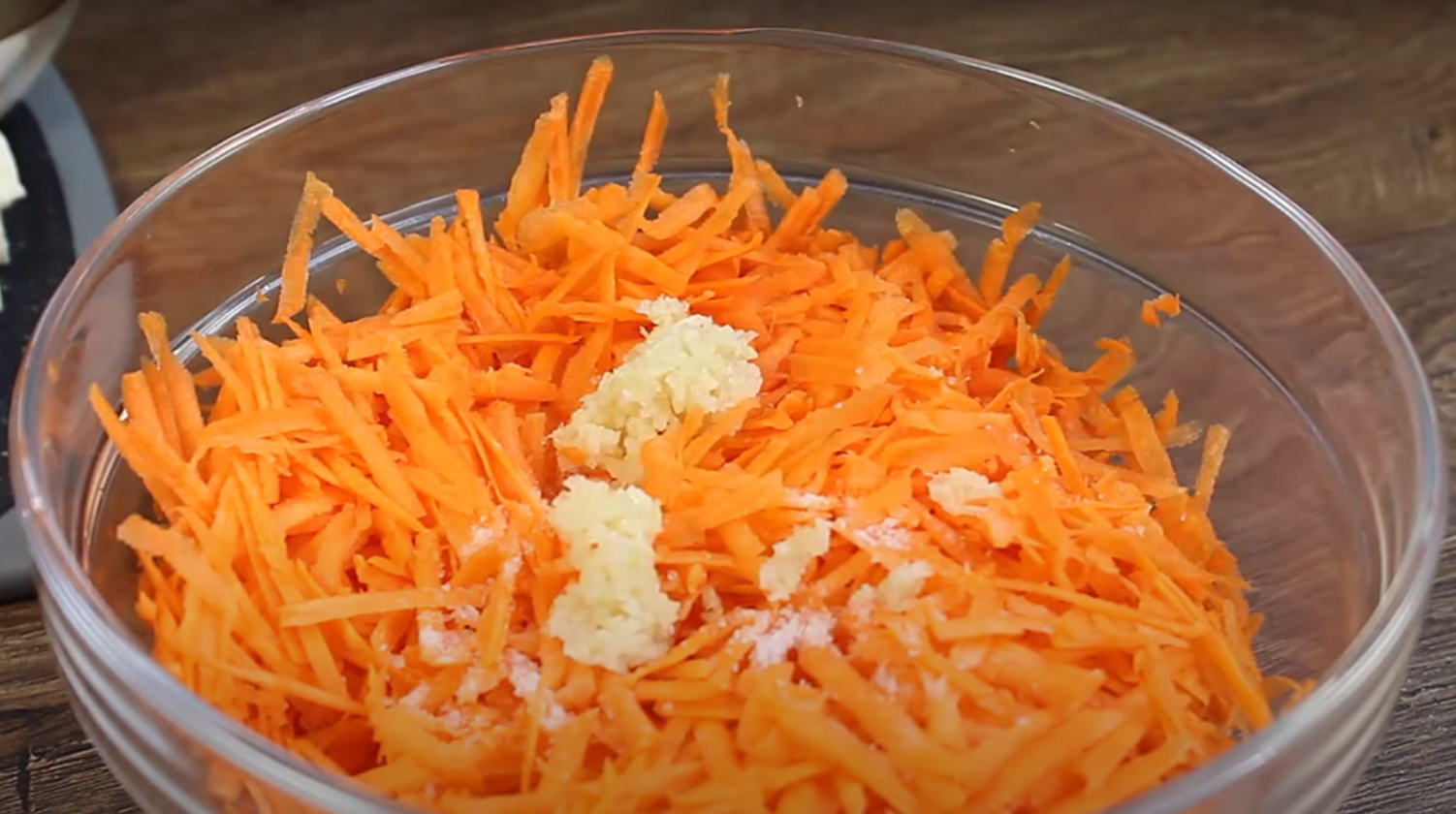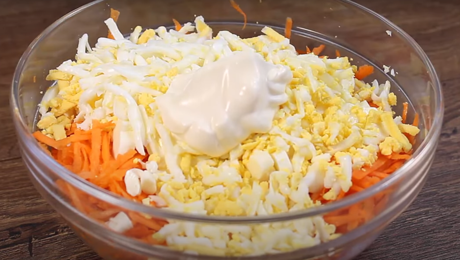 Jako pierwsze ugotuj jajka na twardo, ostudź i obierz z skorupek. Marchewki obierz, zetrzyj na tarce o największych oczkach. Następnie dodaj przeciśnięty przez praskę czosnek.