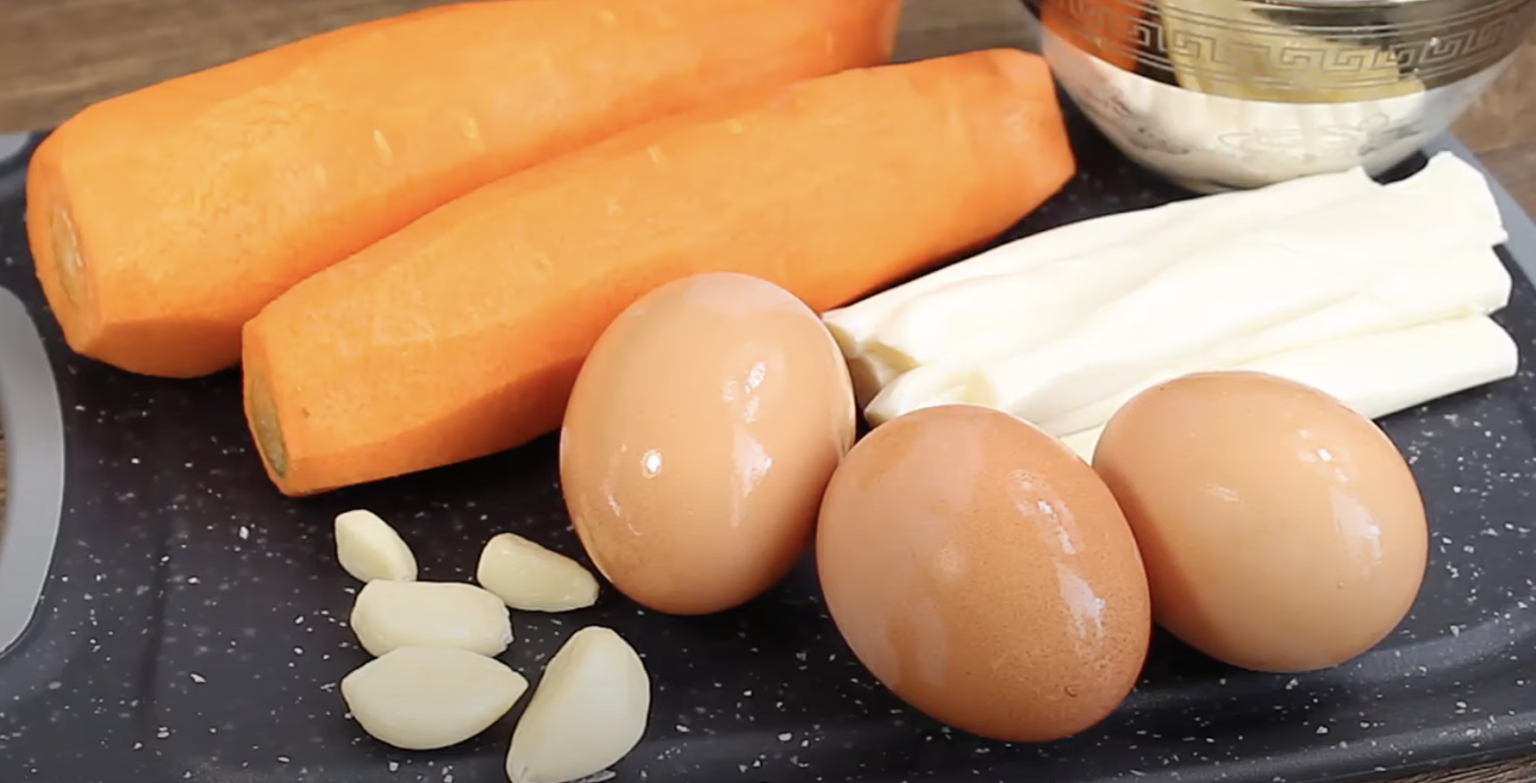 Jako pierwsze ugotuj jajka na twardo, ostudź i obierz z skorupek. Marchewki obierz, zetrzyj na tarce o największych oczkach. Następnie dodaj przeciśnięty przez praskę czosnek.