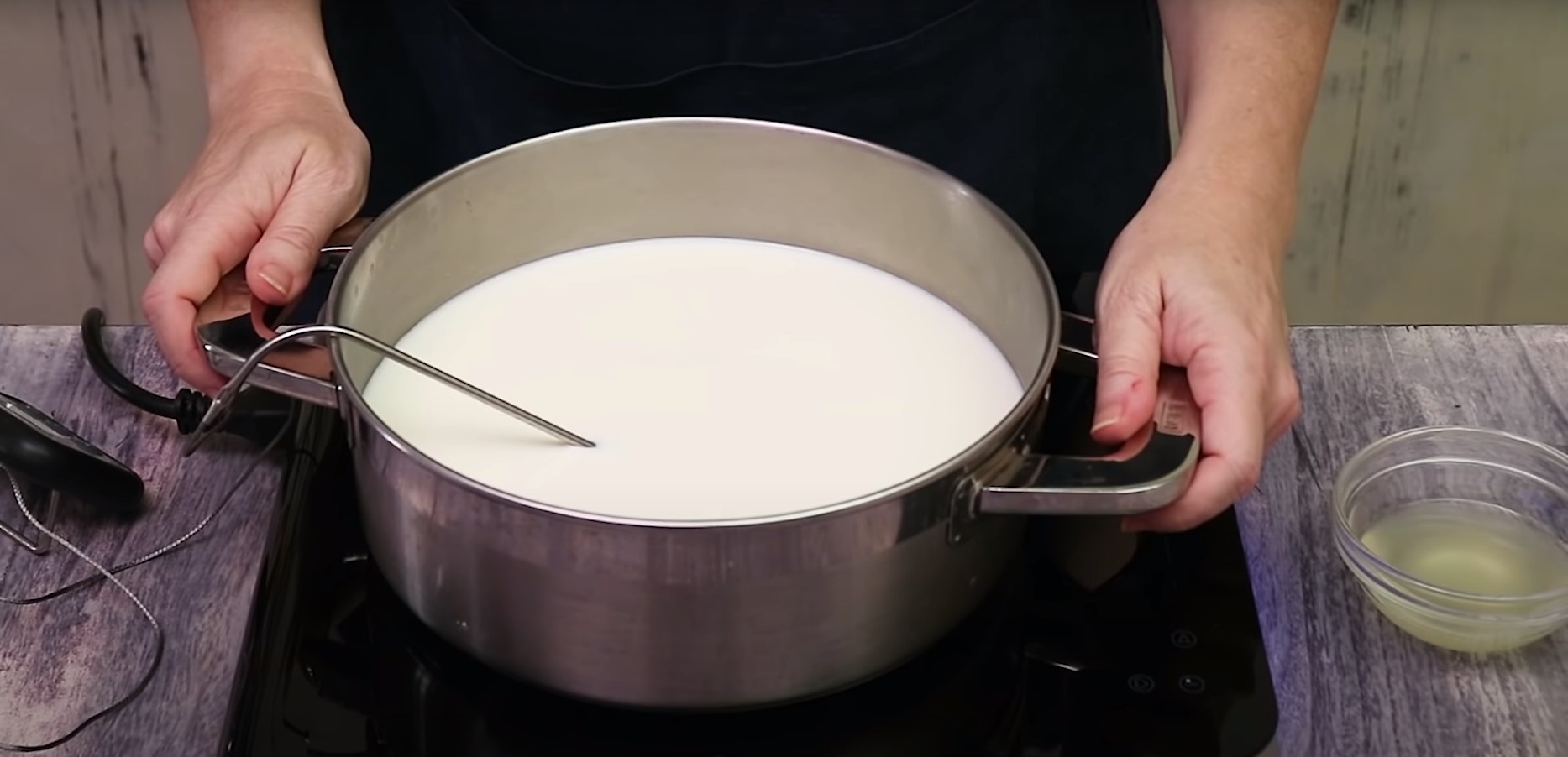 Wlej mleko do garnka i włóż na kuchenkę. Zanurz w nim termometr i podgrzewaj do momentu, aż osiągnie temperaturę 90 ° C. Gdy tylko mleko osiągnie tę temperaturę, natychmiast wyłącz kuchenkę i dodaj sok z cytryny.