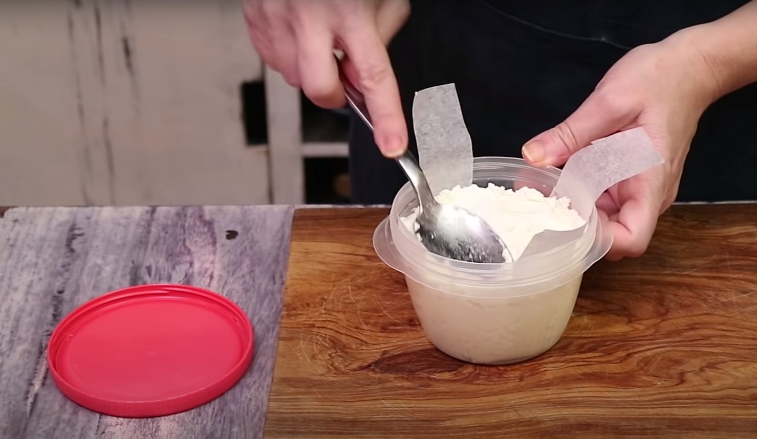 Wylej wodę i odstaw ser na 6 godzin do lodówki na sicie nad miską. Następnie weź małą plastikową miskę i ułóż w niej 2 paski papieru do pieczenia złożone na krzyż. Wsuń go do miski, a następnie za pomocą łyżki i pasków papieru przechyl. Dzięki misce ser będzie miał ładny kształt.