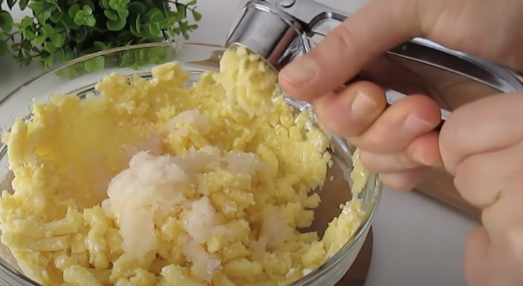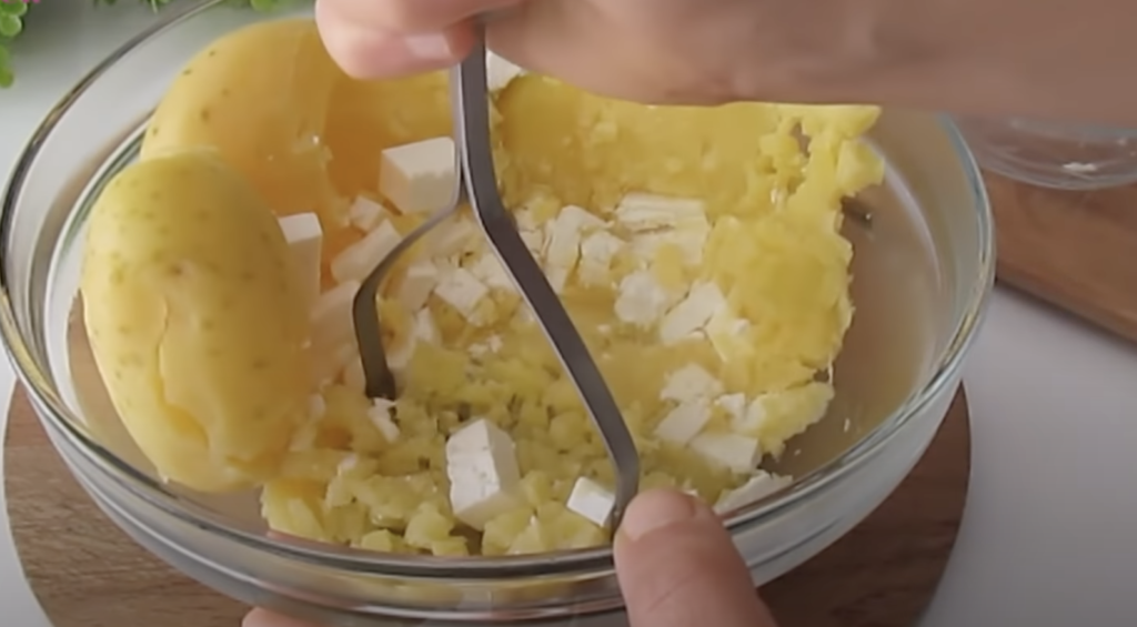 Dodaj pokrojony w małą kostkę ser i dodaj do jeszcze gorących ziemniaków, utłucz na puree. Dodaj przeciśnięty przez praskę czosnek.
