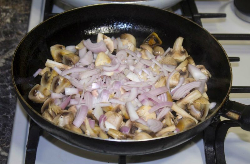 Na patelni rozpuszczamy masło. Podsmażamy na nim cebulę pokrojoną w półpierścienie i grubo pokrojone grzyby. Mięso kroimy w drobną kostkę i wykładamy na patelnię. Wszystko smażymy przez 10 minut. Wlewamy wodę, następnie dodajemy musztardę, koncentrat pomidorowy i tymianek.