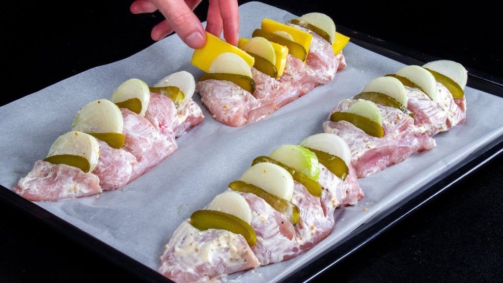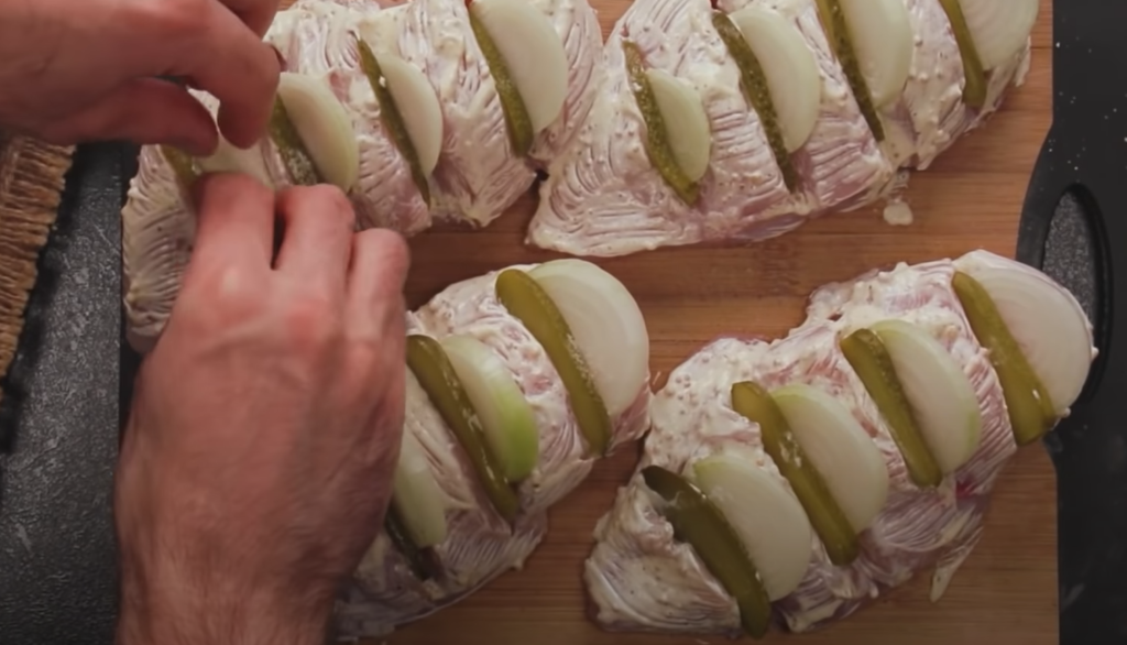 Cebulę obrać, pokroić w kółka. Włóż po jednym do każdego rowka. Ogórki kroimy wzdłuż. Każdy plasterek wkładamy również do rowka w mięsie.