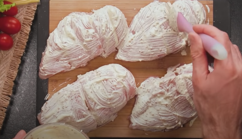 W piersi kurczaka wyciąć kilka głębszych rowków u góry, posolić i doprawić. W misce wymieszaj majonez z musztardą francuską i dokładnie natrzyj ten kawałek mięsa tą mieszanką.