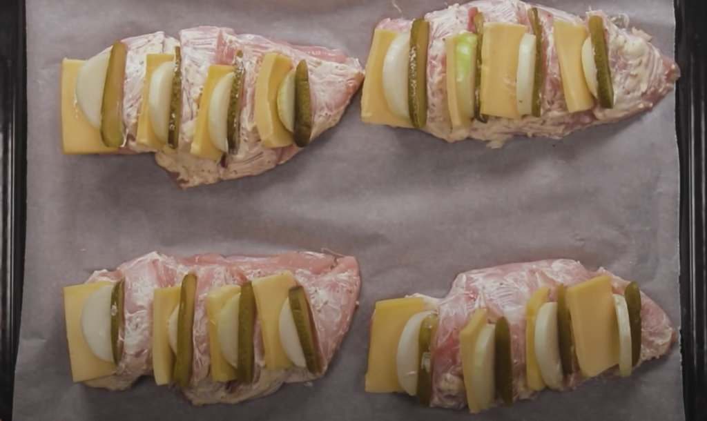 Pieczona pierś z kurczaka z ogórkiem, cebulą i serem