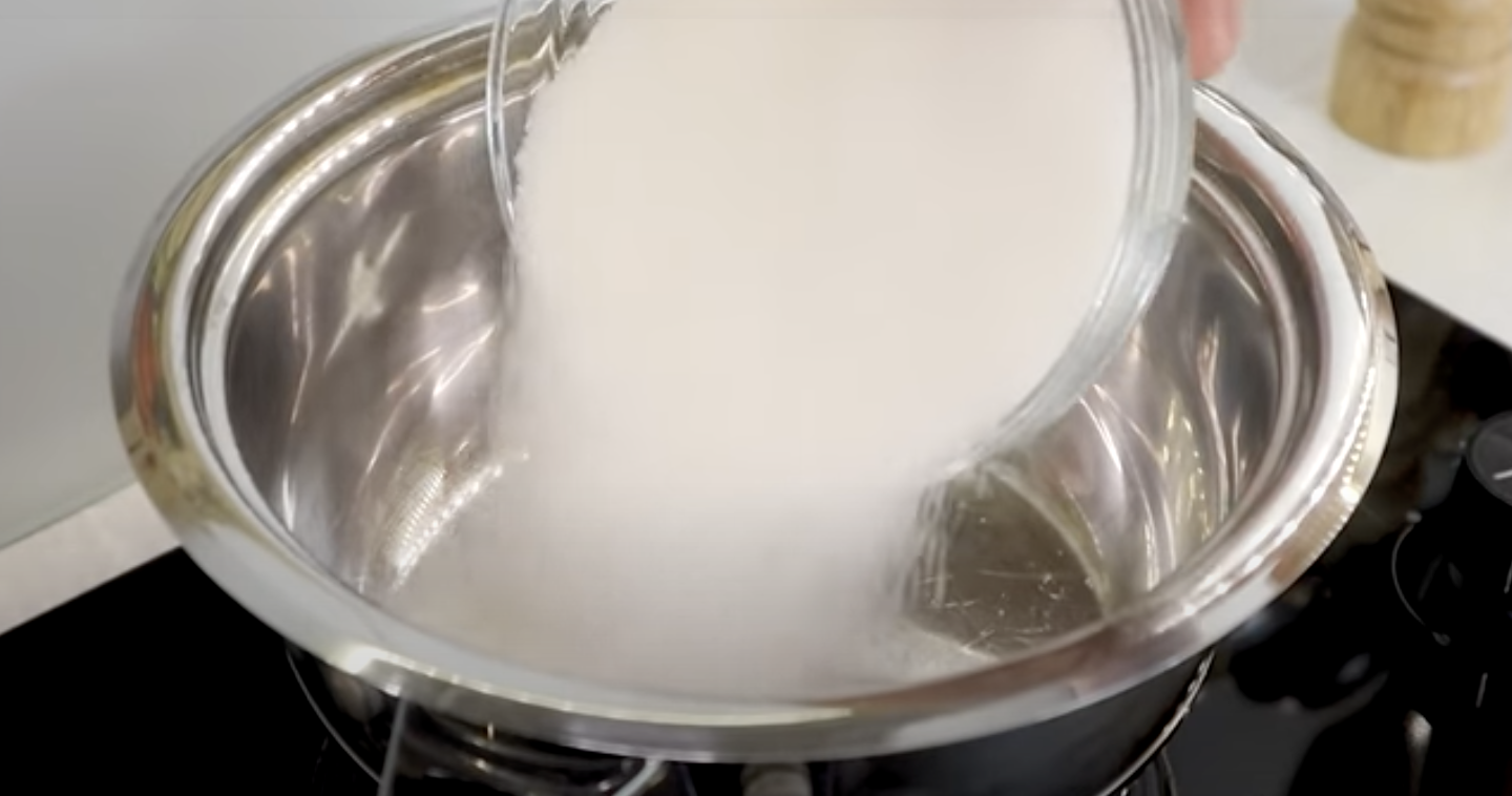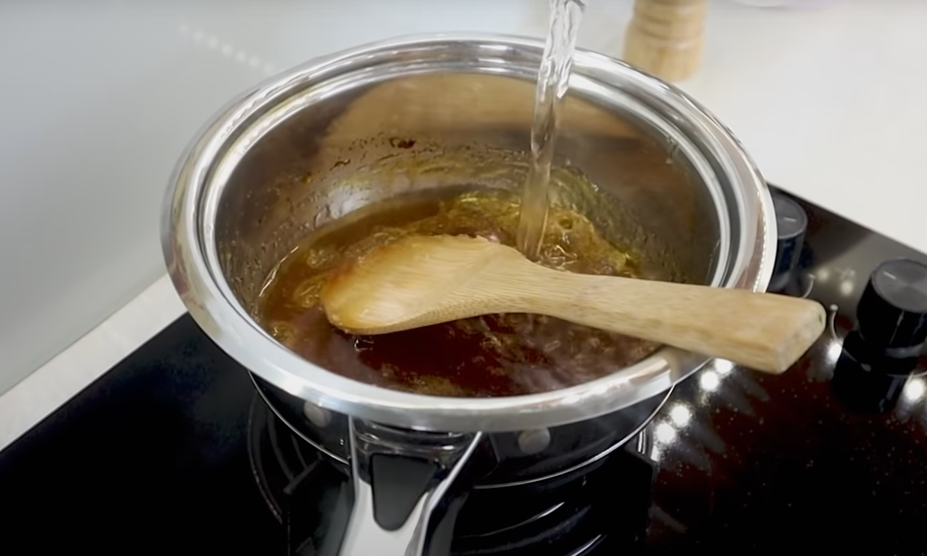 Pozostawić do karmelizacji w niskiej temperaturze, cały czas mieszając. Następnie wlej do garnka 300 ml letniej wody.