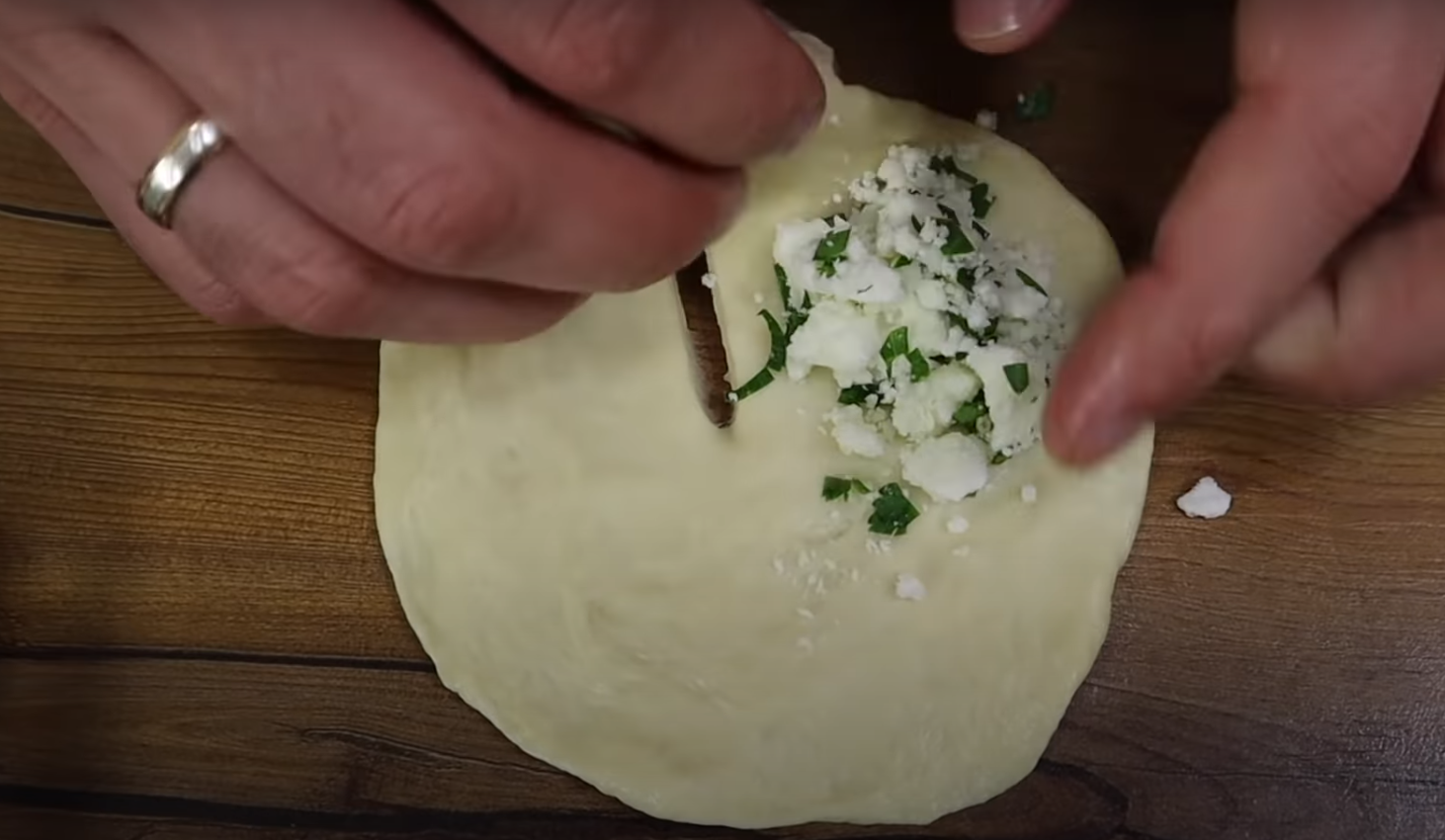 Posiekaj świeże lub suszone zioła i wymieszaj je z serkiem kanapkowym. Jeśli nie lubisz serka, wybierz inne nadzienie według Twoich upodobań. Następnie stwórz z ciasta długi rulon i podziel go na mniejsze, równe kawałki.