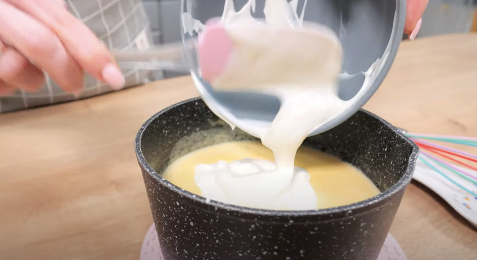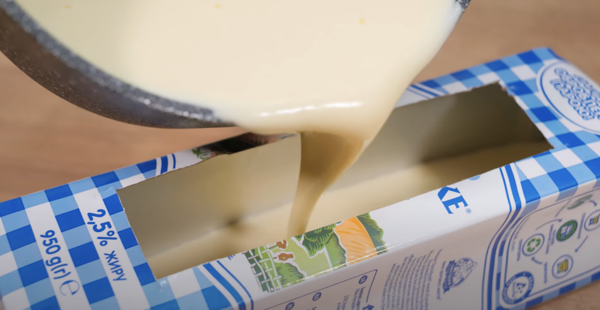 Następnie wlej do niego przygotowaną masę. Opleć kartonik w folię i odstaw do lodówki. Po schłodzeniu przetnij kartonik i gotowe. Deser możesz udekorować ulubionymi dodatkami na przykład kawałkami czekolady.
