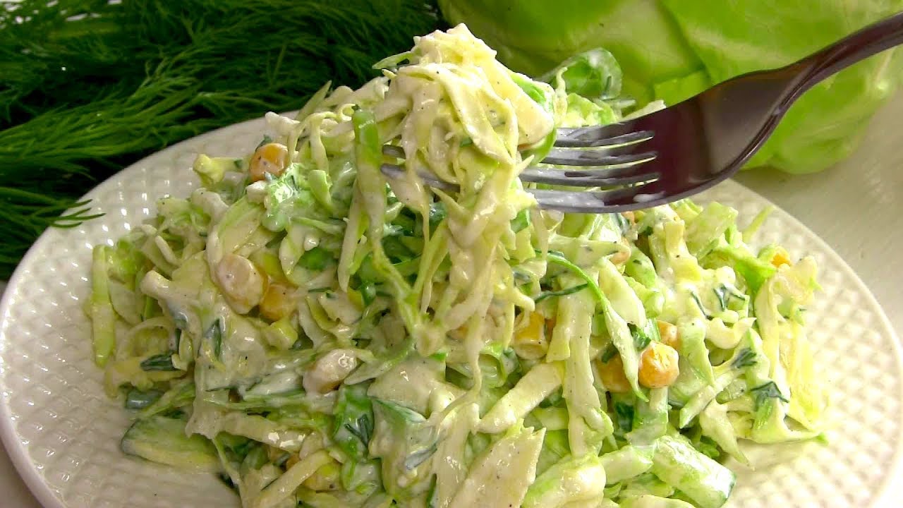 Przygotować sałatkę, szatkując kapustę. Następnie pokroić ogórek na małe kawałki i umieścić w misce. Skropić sokiem z cytryny i dodać obrane, pokrojone w plasterki jabłko. Dodać koperek i kukurydzę, śmietanę lub jogurt, przyprawy według uznania, a następnie wszystko razem wymieszać. Sałatka jest gotowa.