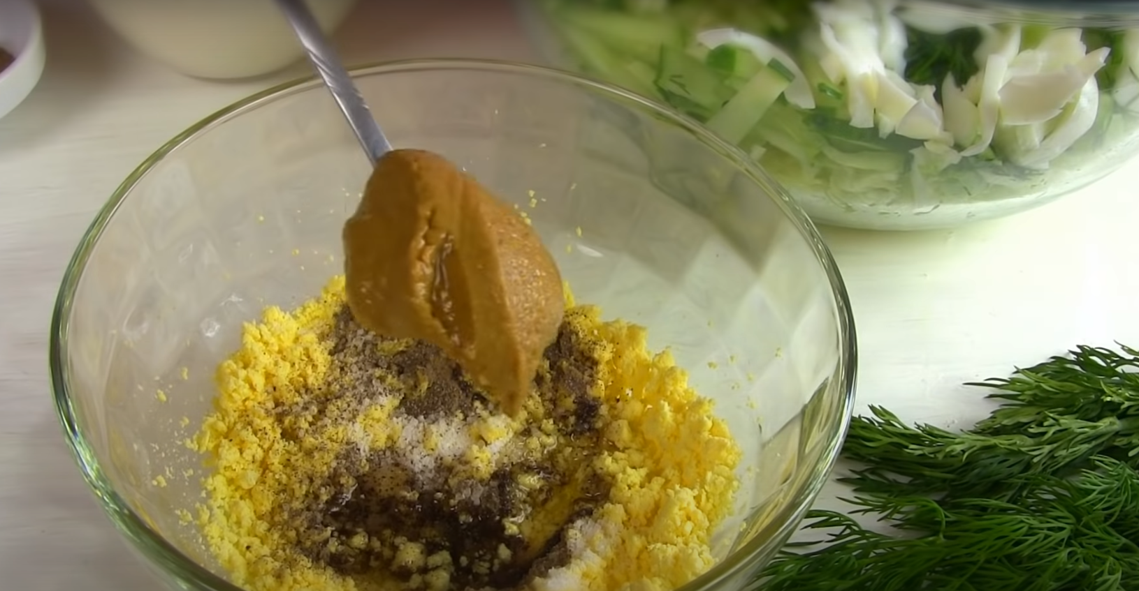 Ogórek i kapustę pokroić w cienkie paski. Dodać kolendrę, koperek i sól. Z ugotowanych jajek oddzielić żółtka i białka. Białka pokroić na małe kawałki. W misce wymieszać białka z olejem, śmietaną i przyprawami. Połącz wszystkie składniki w misce. Dodaj resztę składników do miski i dobrze wymieszaj. Teraz sałatka jest gotowa do spożycia.