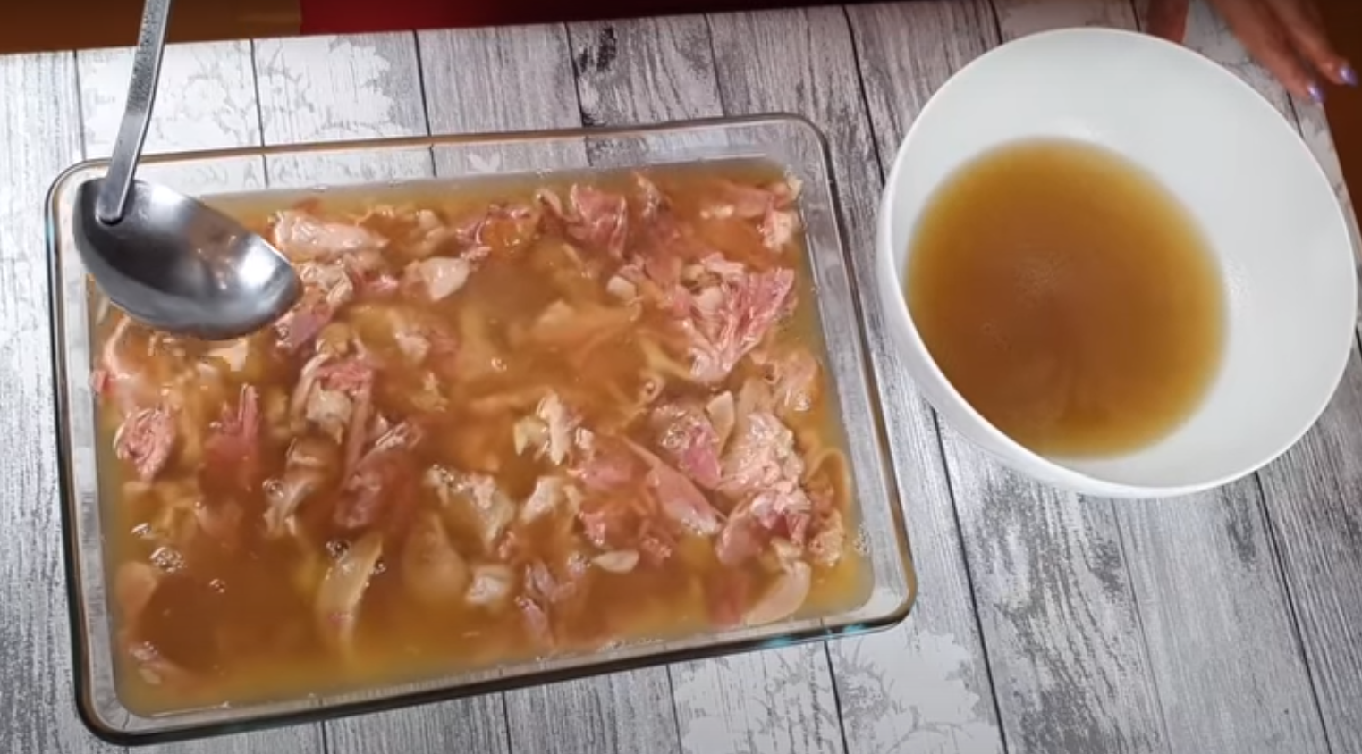 Potem odcedzić czosnek z bulionu i ponownie przecedzić go. Mięso pokroić na małe kawałki.