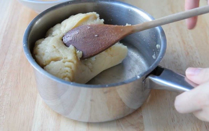 Umieść wodę i masło w małym rondelku na średnim ogniu. Doprowadzić do wrzenia. Następnie dodaj przesianą przez sito mąkę. Powoli mieszaj mieszankę, aż będzie gładka. Wymieszaj ciasto, aż będzie gładkie. Do rondla dodawać po jednym jajku, cały czas mieszając.