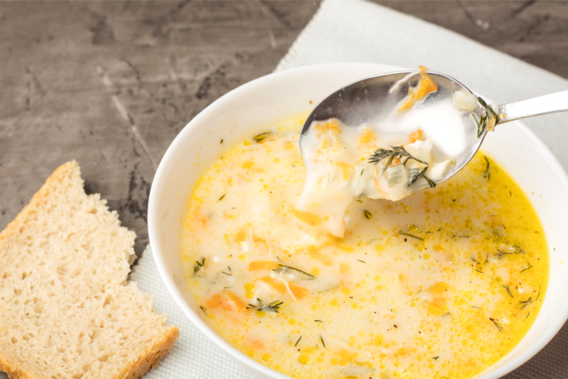 Zupa śnieżka szczególnie wyśmienicie smakuje podawana na gorąco, z kleksem śmietany i dodatkową porcją ziół.