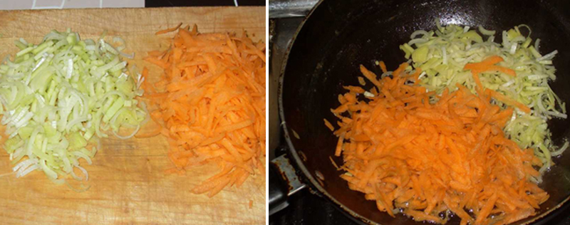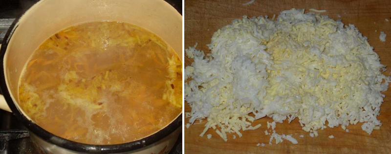 Dokładnie umyte i obrane warzywa zetrzyj na grubej tarce. Następnie pokrój w średnią kostkę ziemniaki a jajka ugotuj na twardo. Starte na tarce warzywa podsmaż na maśle, aż cebula będzie przezroczysta. Do gotującego się bulionu dodaj ziemniaki i groszek z puszki a następnie gotuj aż ziemniaki będą półmiękkie.