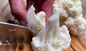 Dodajemy pokrojony seler naciowy i różyczki kalafiora, gdy warzywa zmiękną. Zalewamy wszystko litrem wody, dodajemy sól i gotujemy pod przykryciem.