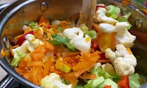 Dodajemy do niej startą marchewkę i smażymy, aż warzywa zmiękną. Następnie wkładamy paski czerwonej i żółtej papryki i smażymy je razem z innymi warzywami.