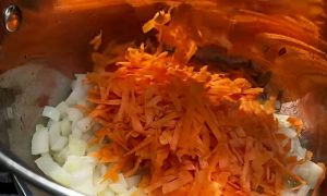 Przepis zaczynamy od smażenia pokrojonej cebuli w garnku z olejem roślinnym.