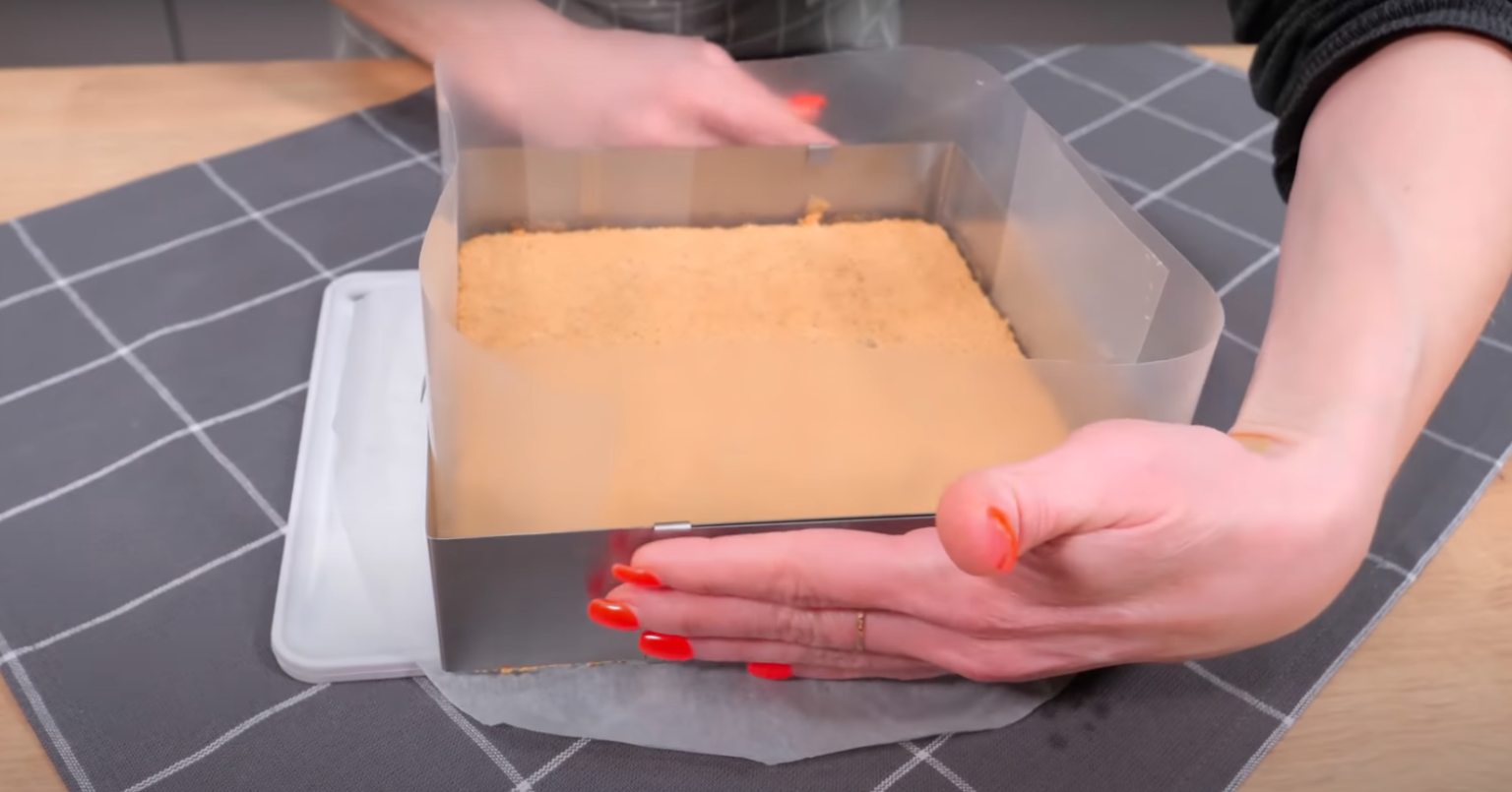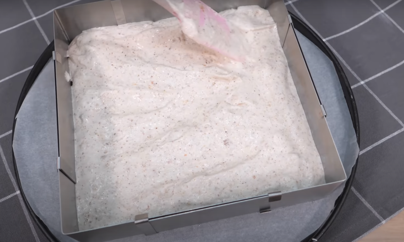 Formę o wymiarach 20 cm x 20 cm należy wyłożyć papierem do pieczenia, a boki blachy posmarować olejem. Na tak przygotowaną formę wykładamy przygotowane wcześniej ciasto i wkładamy do nagrzanego piekarnika. Całość należy piec około 20 minut w temperaturze 170 stopni.