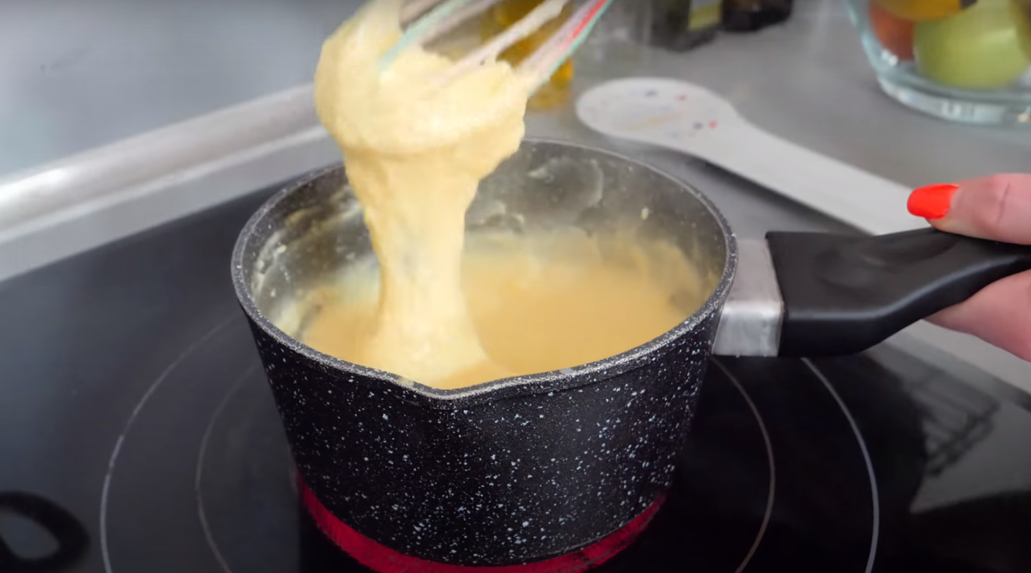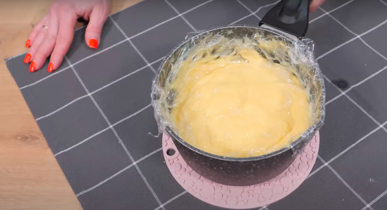 Czas, w którym ciasto jest w piekarniku należy poświęcić na przygotowanie kremu. W tym celu do garnka wlewamy mleko oraz ubijamy żółtka z cukrem pudrem oraz cukrem waniliowym przy pomocy trzepaczki. Następnie mieszamy ubite jajka ze skrobią kukurydzianą w taki sposób, aby nie było żadnych grudek.
