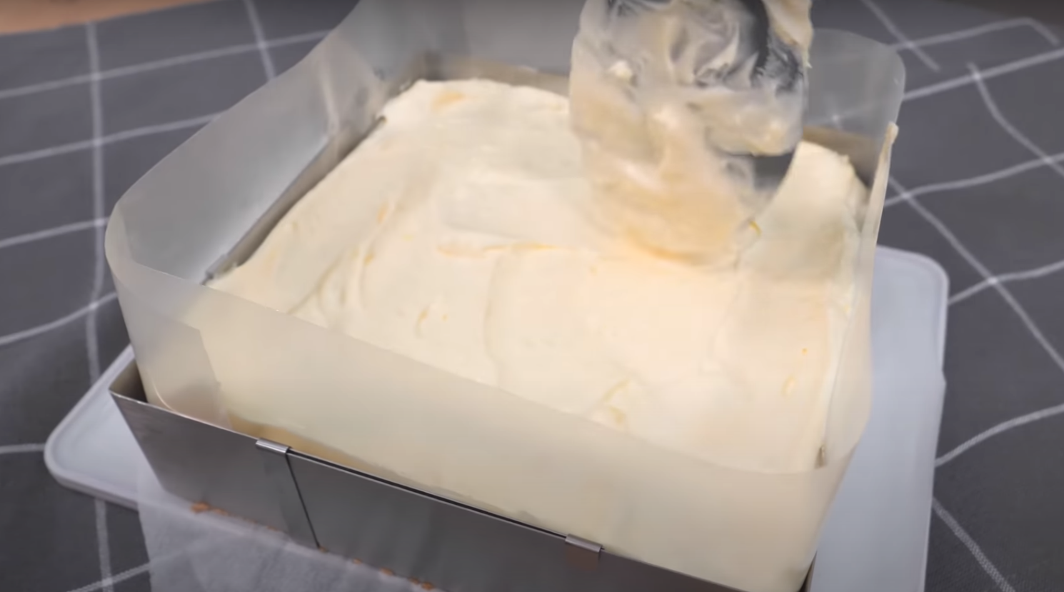 Wyjmujemy ciasto z piekarnika, oddzielamy brzegi od formy i jeżeli forma jest niska, to wkładamy pomiędzy ciasto a krawędź formy pasek foliowy lub z papieru. Smarujemy go olejem. Ostudzony krem mieszamy z ubitą schłodzoną śmietaną, a następnie wykładamy całość na ciasto.