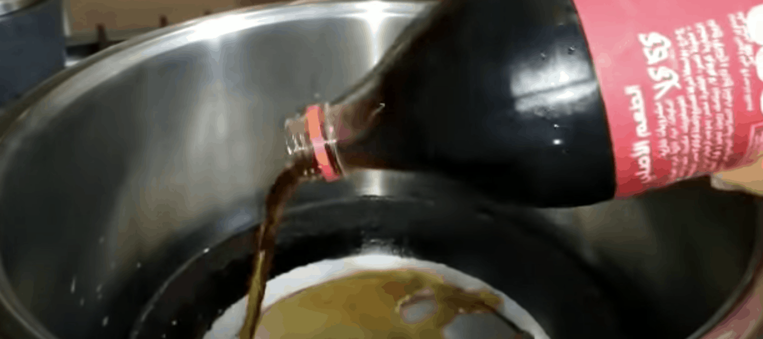 Patelnię z przypaleniami włożyłam do dużego garnka i zalałam colą.