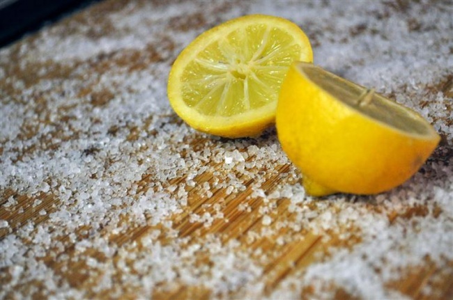 Brudną deskę należy posypać solą morską, następnie wycisnąć sok z połowy cytryny i polać po wierzchu. Pozostawiamy wszystko na kwadrans, po czym bierzemy kolejną połówkę cytryny i wcieramy ją w deskę. Na koniec zmywamy wszytko pod bieżącą, letnią wodą.