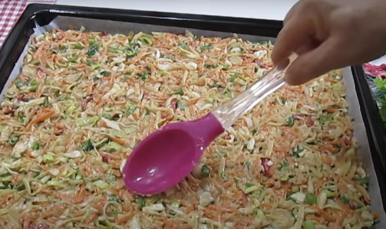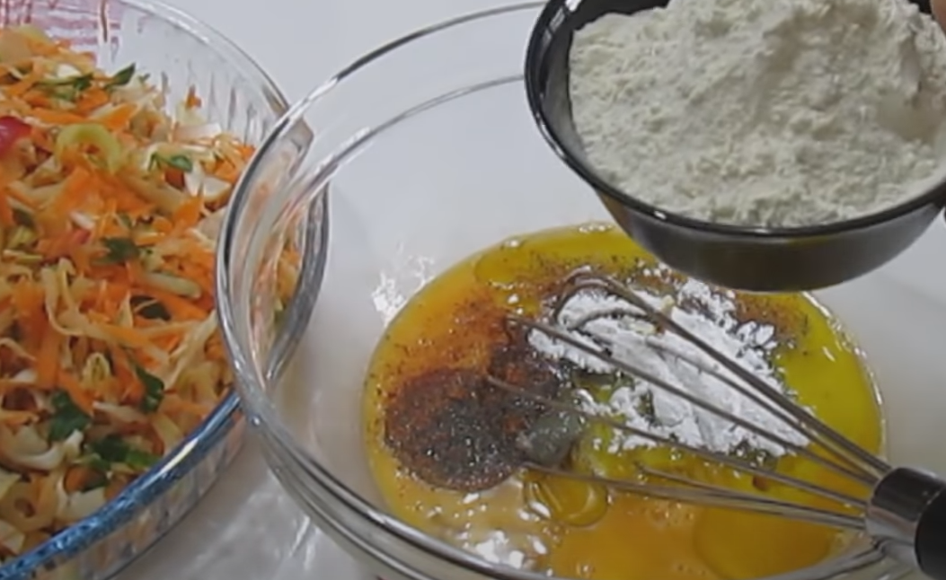 W osobnej misce ubij jajka za pomocą trzepaczki, dodaj mleko, olej, przyprawy, sól, proszek do pieczenia i mąkę, wymieszaj. Dodaj mieszankę do warzyw i również wymieszaj.