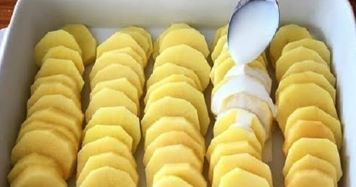 To danie smakuje obłędnie: Pokrój ziemniaki w plasterki, ułóż na blaszce, zalej tą mieszanką.