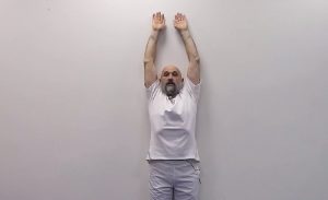 Pod ścianą ustawić się należy, z biodrami, piętami, plecami i głową dotykającymi jej powierzchni. Nogi i pośladki wraz z ciałem linię prostą tworzą. Ręce, wyciągnięte wzdłuż ściany, unieść należy nad głową. Wdychając głęboko, ręce podnieść wysoko nad siebie, zaczynając od palców, poprzez dłonie, aż do przedramion.